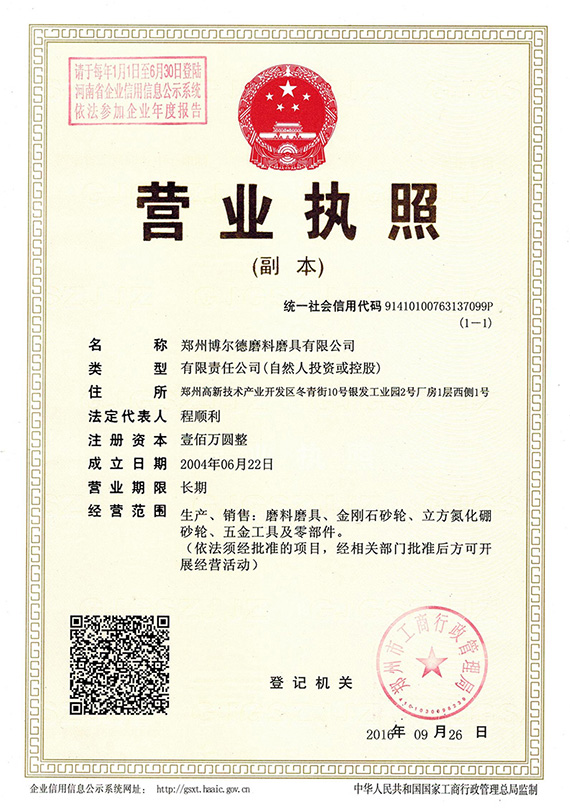 鄭州博爾德磨料磨具有限公司質量管理體系認證 GB/T19001-2016/ISO9001:2015